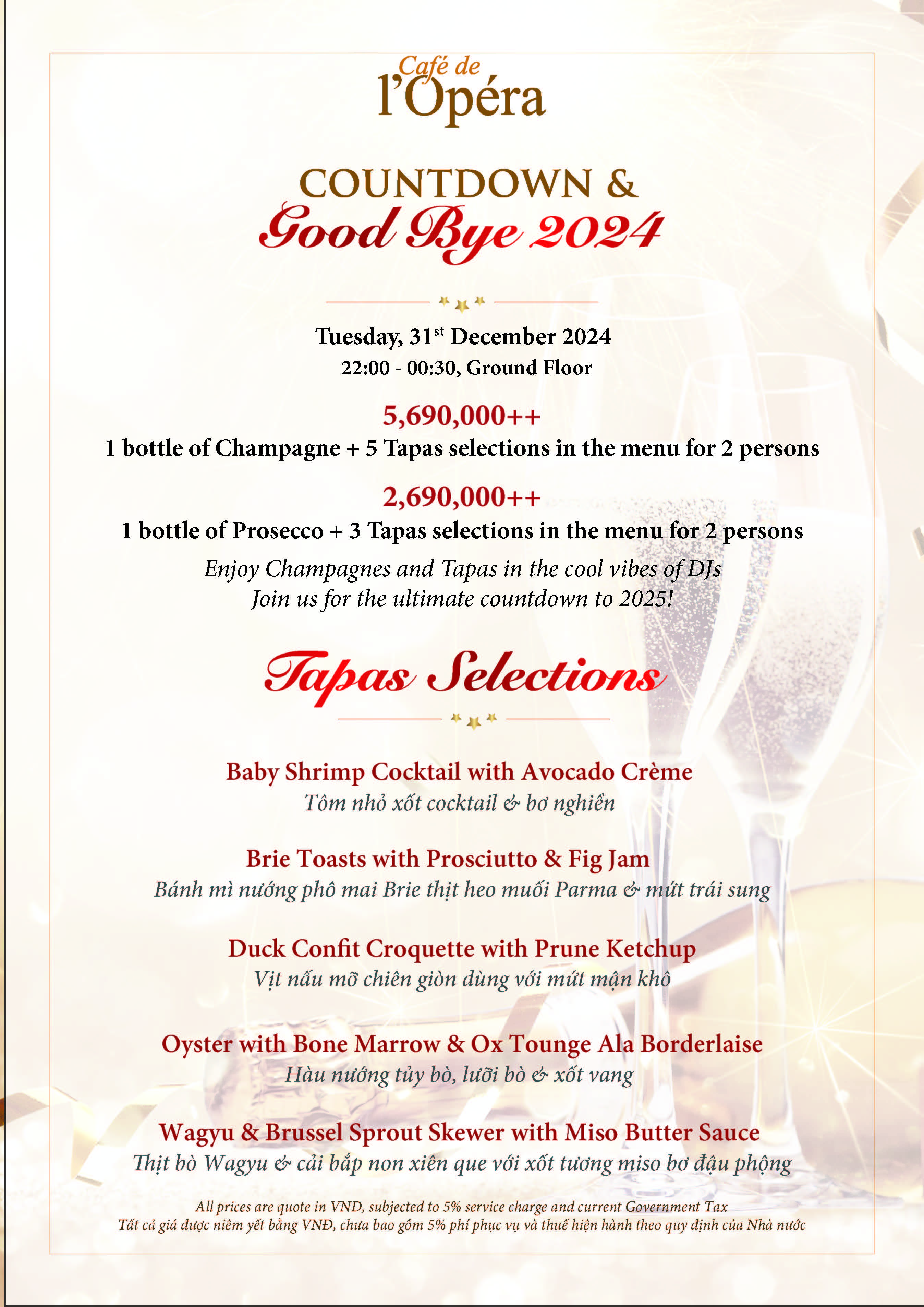 * VND 5,690,000++, including 1 bottle of Champagne & 5 Tapas selections.